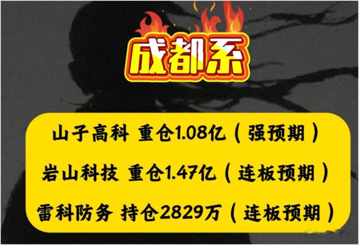 成都系重仓山子高科、岩山科技,还拿着雷科防务。山子高科和岩山科技的业务布局都挺有亮点,成都系的持仓也体现了他们对这些个股成长空间的认可。