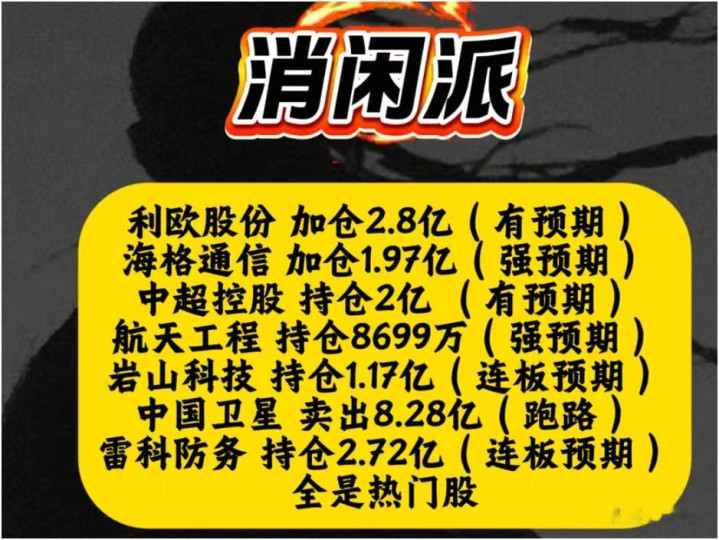 消闲派的操作就更丰富了,利欧股份加仓2.8亿,海格通信加仓1.97亿,中超控股、航天工程、岩山科技都有持仓动作,唯独中国卫星卖出8.28亿。这里面其实挺有门道,加仓的多是当前市场的热门板块和个股,而减持中国卫星,可能是觉得其短期空间有限了。像海格通信在卫星通信领域的布局,一直是市场关注的焦点,加仓动作也契合了当下的市场热点。
