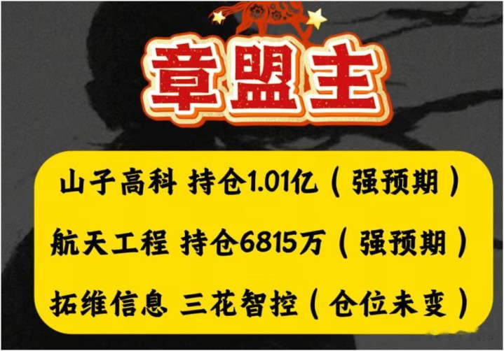 章盟主对山子高科和航天工程都下了重注,还拿着拓维信息、三花智控没动。山子高科在新能源领域的布局,航天工程在军工航天板块的地位,都是章盟主看中的点,这也反映出他对新能源和军工板块的长期关注。