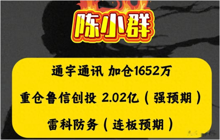 先看陈小群,这位大佬加仓通宇通讯1652万,还重仓鲁信创投2.02亿,对雷科防务也抱有连板预期。要知道,鲁信创投在创投板块里一直是个“风向标”式的存在,陈小群敢砸这么多钱进去,说明他对创投板块的预期是相当高的。通宇通讯在通信设备领域的技术优势也挺突出,加仓动作或许是看好其在行业里的进一步表现。