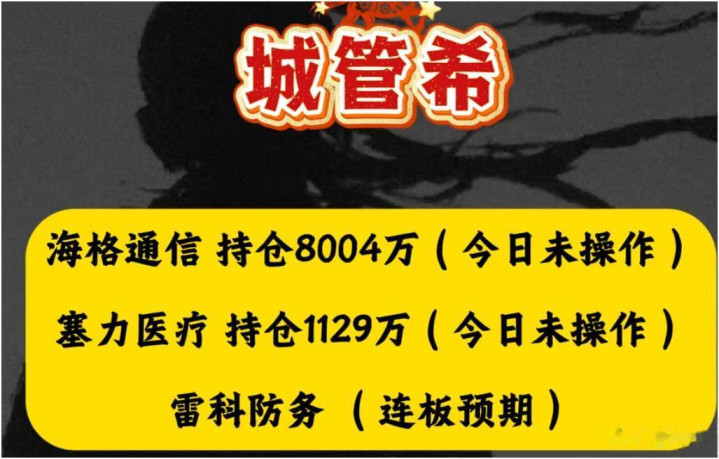 城管希拿着海格通信、塞力医疗没动,同时持有雷科防务。海格通信的卫星通信概念,塞力医疗在医疗服务领域的表现,都是他关注的点,这也给咱们提供了一个观察这些板块的视角。